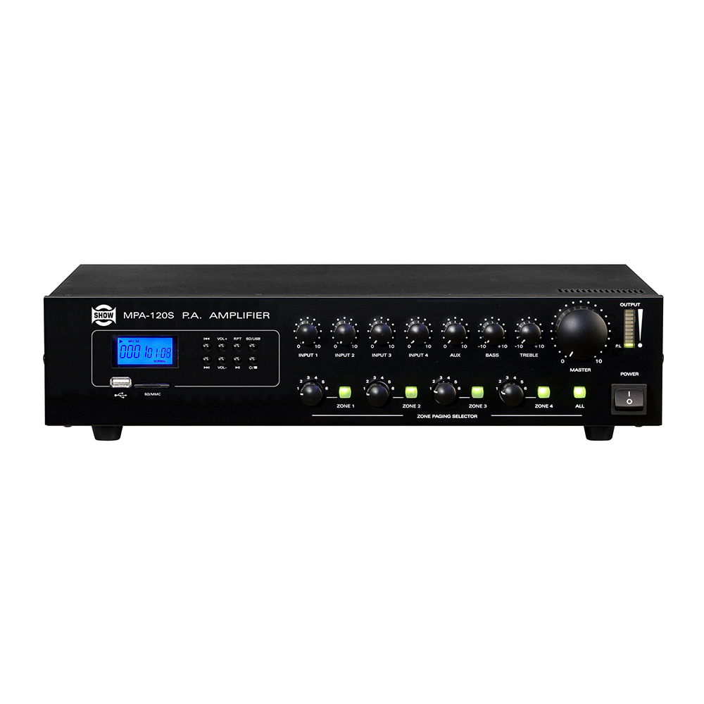 The MPA-120S is a P.A. amplifier specifically designed for commercial applications. It is an ideal solution for bars, restaurants, retail outlets, offices, and other applications where paging and background music are required. The MPA-120S combines a 120 W amplifier with a five inputs mixer; it is a versatile and easy operating paging system. Mono inputs are available on combo balanced XLR / TRS 6.35 mm jacks. A switch on each input selects a line or microphone level with a 24 V phantom power option. A microphone plugged into input 1 can automatically mute other sound sources; the function is activated by the microphone signal. The priority can also be activated by the Tel. Input signal. The MPA-120S features a MP3 player for BGM or message paging. An insert out/in is available to connect signal processing devices, like delay units, EQs or anti-feedback systems. The main output section accepts 25, 70 and 100 V constant voltage line or 4 Ω impedance loads. Four additional switchable zone outputs are available with their own volume control. The MPA-120S can also operate with a 24 V DC power supply.