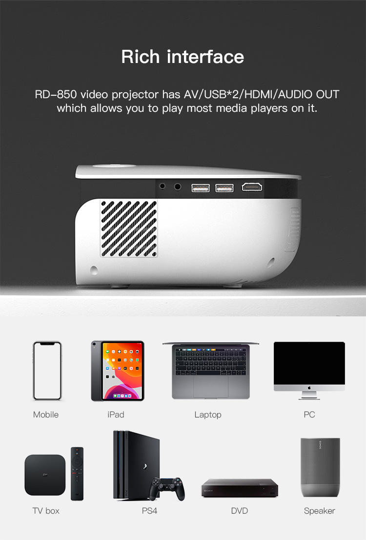The Rigal RD-850 Projector is a high-quality Full HD 1080p projector, perfect for home entertainment, gaming, and presentations. With 2000 lumens brightness and a screen size of up to 120 inches, it delivers crystal-clear visuals and vibrant colors. Equipped with Bluetooth connectivity, you can easily connect external speakers for an immersive audio experience. The compact and stylish design, along with multiple input options (HDMI, USB, AV, and wireless screen mirroring), makes it an excellent choice for versatile entertainment setups. Whether you're watching movies, gaming, or sharing presentations, the Rigal RD-850 offers a premium viewing experience at an affordable price.